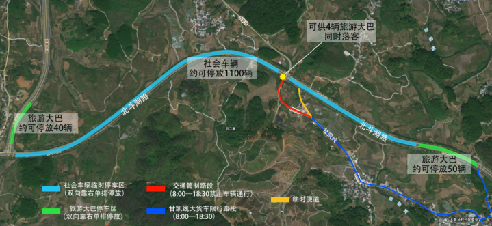 (一)在北斗湖路(西向东倡导)距北斗湖路与甘凯线交叉口120米处开辟临时便谈与甘凯线衔接(原老甘凯流露段),允许车辆从北斗湖路往普马村倡导单向通行。