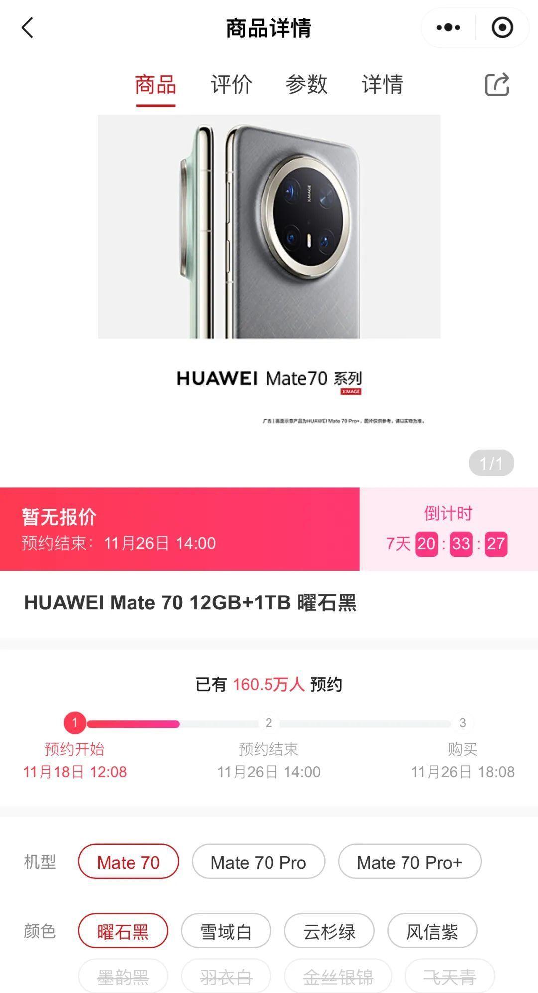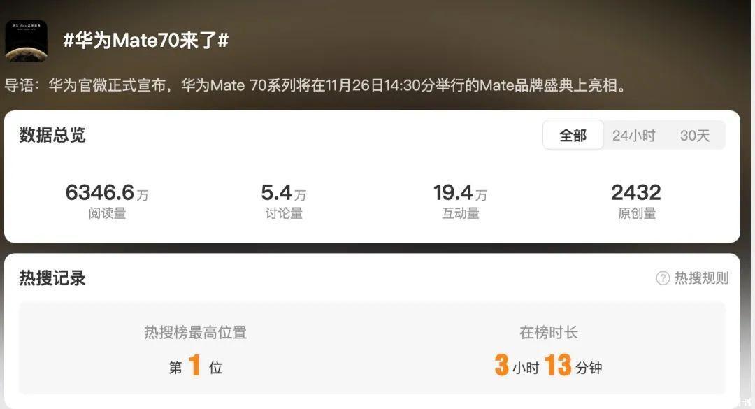 1小时预订量破百万!华为Mate70系列定档11月26日。