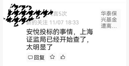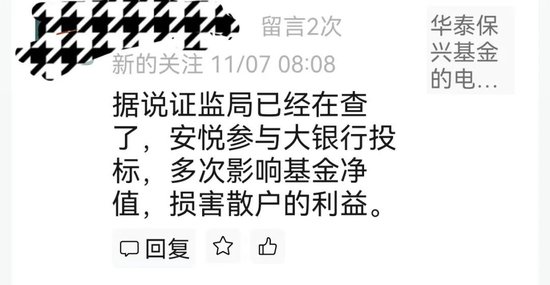问:多东谈主爆料称华泰保兴安悦债券基金参与大银行投标,影响基金净值,毁伤散户利益。证监局也已经运转看望?