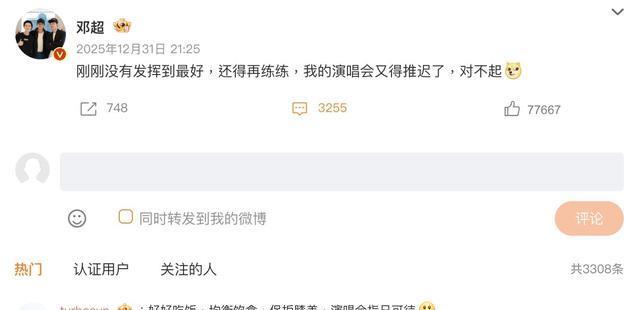 邓超在31日受邀到海南省五源河指点场的跨年演唱会上饰演,他一连演唱了《超等好汉》等3首歌曲,不仅开麦、原声演唱,更是边唱边跳,卯足了全力,但他过后颓唐地在微博发文「刚刚莫得施展到最佳,还得再练练,我的演唱会又得推迟了,抱歉」,关于我方的发扬感到不是很欢然。