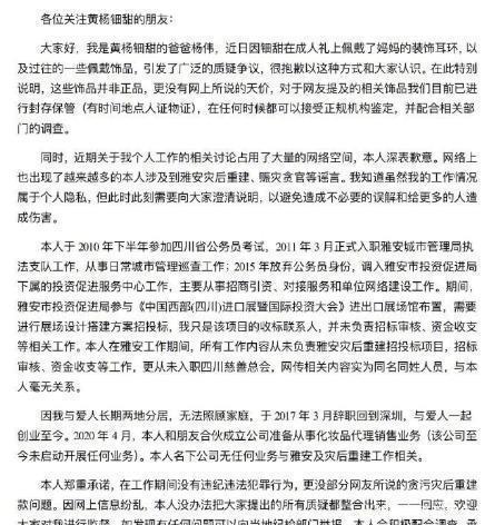 眼瞅着自家小姐跟我方快被公论淹了,黄爸爸杨伟急得不行,赶快出来熄灭。他说,那耳饰根本儿就不是啥天价的东西,等于个仿成品,地说念是戴着玩儿的。