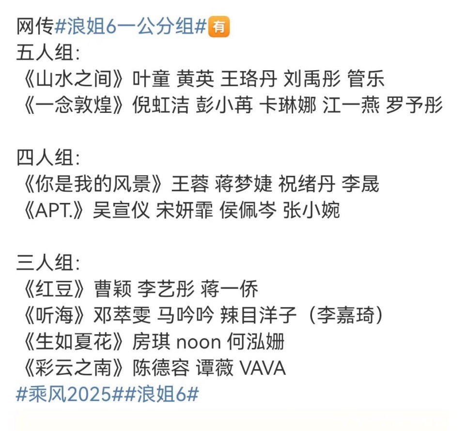 最新一期《浪姐6》已悄然上线,嘉宾声势、分组信息也冉冉浮出水面,天然仍未官方晓示,但节目实验和话题性照旧在收罗上激勉了不少商议。许多不雅众惊奇,尽管节目依然保捏着较高的水准,但相较于前几季,本年的声势似乎略显失色。