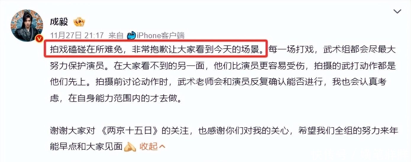15. 当晚,他在微博发文报吉祥,跟跟蜻蜓点水地说:“拍戏中的磕碰实属寻常”,并十分强调“技击劝诱团队比演员靠近更多风险”。