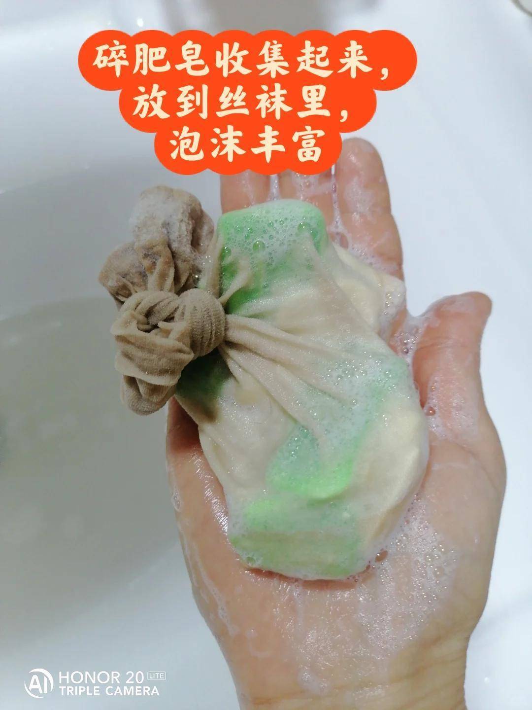 这时,可将不穿或穿破的丝袜用来收纳肥皂碎。重新组合后的肥皂不仅能再次使用,而况丝袜的网状结构有助于起泡,使用起来愈加省力。