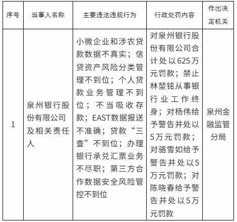 把柄关系端正,泉州金融监管分局对泉州银行总共处以625万元罚金,闭塞林堃铭从事银行业职责毕生,对杨伟给以教化并处以5万元罚金,对骆雪如给以教化并处以5万元罚金,对陈晓春给以教化并处以5万元罚金。