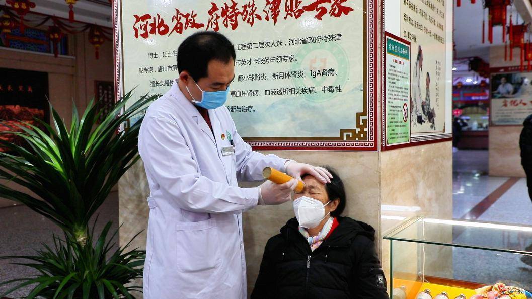 迁安市中医病院的医务东说念主员在膏方节上为市民作念艾灸。王志斌摄