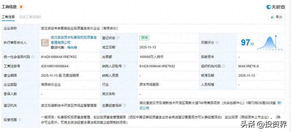投资界(ID:pedaily2012)11月19日音问,天眼查工商信息深切开yun体育网,近日,武汉武创未来智能创业投资基金合股企业(有限合股)建立,出资额10亿元,接洽范围为私募股权投资基金搞定、创业投资基金搞定行状、创业投资。