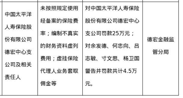 蓝鲸新闻12月27日讯体育游戏app平台,近日,国度金融监督科罚总局德宏监管分局发布了罚单,剑指中国太平洋东谈主寿保障股份有限公司德宏中心支公司偏激干系包袱东谈主。罚单分解,中国太平洋东谈主寿保障股份有限公司德宏中心支公司的主要行恶非法事实(案由)为:未按照规定使用经备案的保障费率;编制不真正的财务云尔虚列用度;虚挂保障代理东谈主业务套取佣金等。针对上述行恶非法手脚体育游戏app平台,国度金融监督科罚总局德宏监管分局对其罚金25万元;对余发德、何忠向、吕志敏、寸文念念、杨卫国劝诫并罚金总共4.5万元。